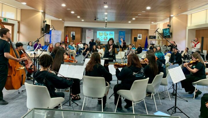 Dentro del programa se desarrolló la charla-taller “Más lentes y conexiones: Hacia una educación artística situada y transformadora”, dictada por la experta Rosario García Huidobro, quien abordó herramientas y enfoques para una educación artística contextualizada y vinculada al entorno. La presencia de actores estratégicos del sistema educativo permitió que las reflexiones de la jornada dialogaran directamente con las realidades y desafíos del territorio. Las y los asistentes conocieron diversas experiencias regionales de mediación, proyectos locales y prácticas pedagógicas impulsadas por escuelas, organizaciones culturales y fundaciones de la región. La instancia también incluyó una muestra artística de la Orquesta de Cuerdas de Hualaihué, quien destacó por el talento demostrado por los jóvenes músicos.