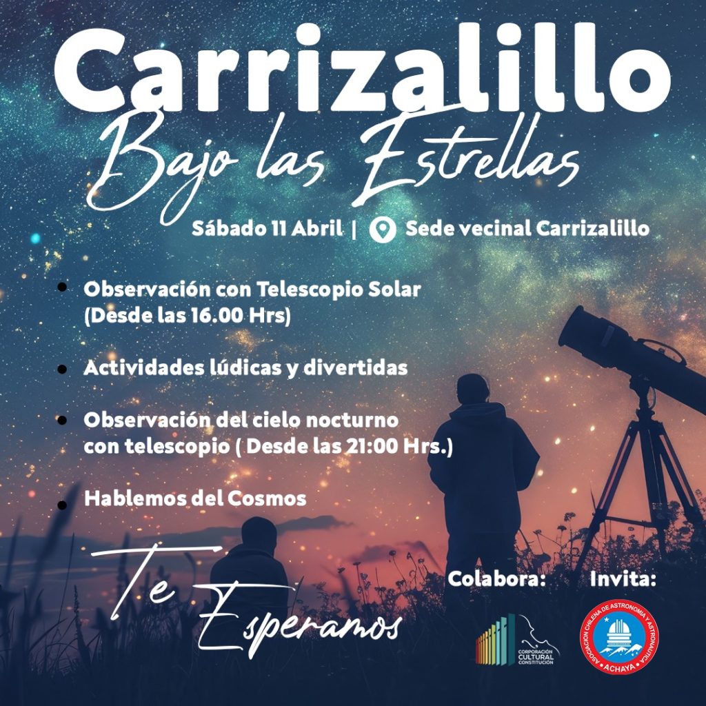 Una experiencia poco habitual en el territorio, que conjuga ciencia, educación y participación comunitaria, se desarrollará en el sector rural de Carrizalillo, al norte de la comuna de Constitución, con la realización de la actividad “Carrizalillo Bajo las Estrellas”, iniciativa impulsada por la ACHAYA, y que cuenta con el apoyo de la Corporación Cultural Municipal de Constitución.